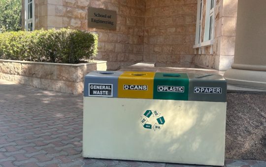 Sustainable bins on campus with markings designating general, canned, plastic, and paper waste. Sustainability continues to be an important focus...